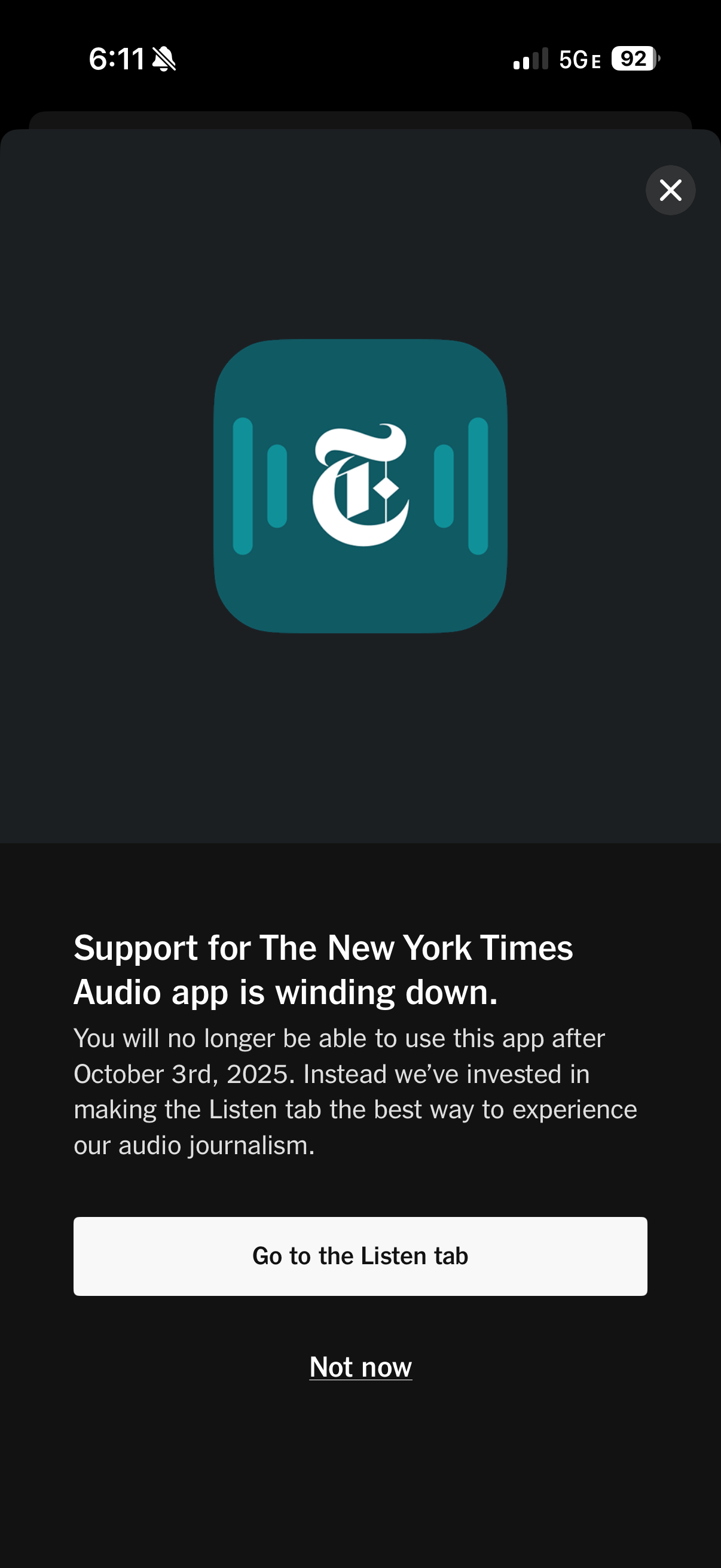 It’s been a while since the last newsletter. I blame the always‑crazy, post-Labor Day, back‑to‑school madness that is September. I felt moved to write as today the sun has officially set on a product that defined a distinct four‑year chapter of my career. I spent a total of seven years at The New York Times, and the team I built and the work we did in Audio between 2020–2024 is the Times work I’m most proud of. The launch of the New York Times Audio app was our first and biggest milestone on that journey.