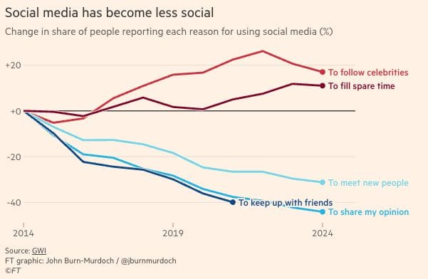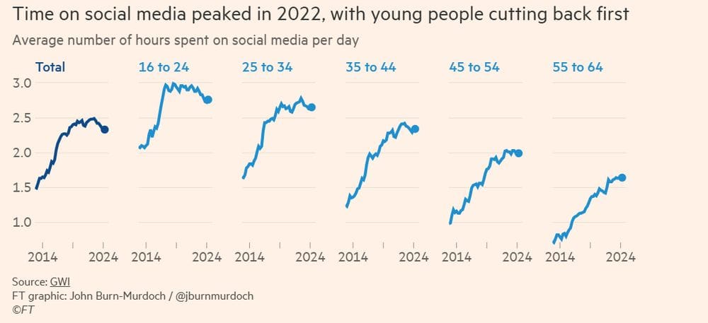 📉 Social Media In Decline? - I found these two charts from this Financial Times piece from John Burn-Murdoch to be both depressing (the reasons people give for using social media) and hopeful at least globally (we seem to have hit a peak in social media in 2022, with younger people leading the charge on the pullback) Unfortunately, the United States seems to be the exception 😞